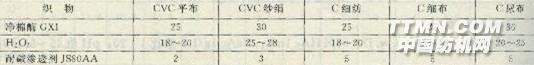 以同一坯布(60×60,90×88)做试验,用净棉酶处理的织物其强力损伤小,甚至不损伤纤维,失重率低,织物厚实、丰满。 ②不同织物净棉酶生产处方及毛效情况(表3—55、表3—56)。 表3-55各种织物酶练处方 单位:g/L