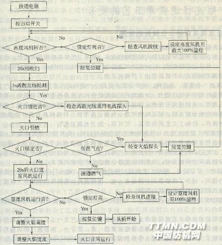 图3-6 自动控制火焰高度、幅宽启动流程 JD型及YM一602型电热接触烧毛单元机,皆具有自主知识产权,获国家专利证书。烧毛接触面温度在800~850℃;去除小棉结效果非常明显;单元机具有加工幅向左右加压微调机构,有效调节布面烧毛的均匀度;单元机设有升降式保温装置,使圆筒表面的清洁工作更易操作;加热功率PID控制,动态过程呈平稳升降温;烧毛成本大幅度下降。 电热接触式烧毛符合清洁生产要求。 国内对烧毛火口的研究已达到国际先进水平。国产烧毛机的XH型、MJ型火焰喷射式火口,以及FC型复合式烧毛精加工火口、YSC外加热接触式烧毛单元均成绩斐然,皆步入国际先进行列。然而,在机电一体化技术的应用方面,与国外先进机台相比仍有差距。例如德国奥斯托夫(Osthoffsenge)公司早已开发了计算机程序化烧毛操作装置,该装置采用织物表面茸毛检测器与Seng-matie型程序控制器组合。操作者只需设置坯布纤维的成分和组织结构、质量,该系统就可提供一个相应的烧毛程序,对火焰温度、布面温度、烧毛均匀度、烧毛火口位置及布速等参数实施程控。其工艺程控系统排除了人为的随意性,屏幕显示的人机操作界面友善烧毛效果重现性好,