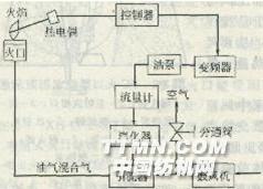 图3~4最佳油气比控制系统示意如图3—4所示,热电偶测得火焰温度信号输入控制器,经模糊控制技术以维持烧毛火焰的最高温度为准则,控制器输出指令,调整变频器的输出,调节油泵转速,以控制燃气的最佳油气比。调节设定好空气通阀的开启度后,气路毋需再控制。最佳油气比控制系统的应用,使烧毛质量稳定在4级以上,耗油量比系统投入前降低5%~10%。TM2A型汽加热汽油气化器,以6—27—12N06.6A型高压离心鼓风机(5.5kW)代替传统的罗茨风机,可节能1/3。(2)火焰幅度的有级自控