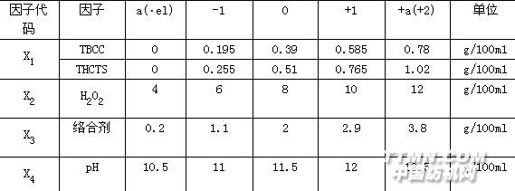 (一)TBCC和THCTS在双氧水冷轧堆工艺中的应用 1、实验 织物:棉18支气流纱,175g/m2园形针织坯 化学品:活化剂TBCC(98%),THCTS(90%)系P&G公司商品 络合剂:二乙烯三胺五甲叉基膦酸(diethylene triamine pantakis(methylphosphonicacid,DTPMP)50% 润湿剂:Vircopin BW 其它化学品系市售化学纯商品。 实验采用中心组合设计法 (Central Composite Experimental Design),取4因子5水平,用Design Expert(V.6.0.8)进行实验设计