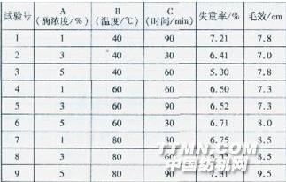 (2)毛效 按标准定时法,测定30 min内水在5 cm×30 cm试样的上升高度。 (3)白度在WSB-II白度仪上测定。 (4)手感用LLY-01B电子硬挺度仪测定平均弯曲长度,结合手触摸的感觉来综合评定。 (5)断裂强力 在YG-026-A电子织物强力机上测定,测三次取平均值。2 结果与讨论2.1 2000L酶工艺的优选 选用Suhong DESIZY