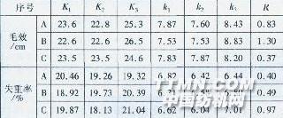 从织物的毛效分析,温度(B)的影响最明显,其次是浓度(A),再次是时间(C)。若以织物的毛效来评定,最佳工艺为A3B3C3。