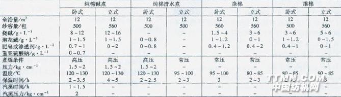 为了去除如油脂、蜡质、棉籽壳以及部分天然色素等棉纤维中的天然杂质,需用烧碱及泡花碱、纯碱、亚硫酸钠、肥皂和渗透剂等助剂精练,以使这些杂质发生皂化、乳化和分解等反应,并从棉纤维上脱离下来,再经水洗去除(水质硬度在30 mg/kg以下为好)。 煮练后纱线应具有如下性能: (1)要求毛效不低于8 em/30 min; (2)纱(线)面pH值7~8; (3)煮练后纱线的强力有所提高,经过大量的数据测试,其煮练后纱线的强力比原纱强力增加2%; (4)纱(线)洁白、匀净,黄斑、污斑不超过3~4级标准(潮纱); (5)无乱纱、皱纱和镶丝纱。1 纱线煮练工艺流程及技术条件1.1工艺流程 (1)卧式锅 拆纱成卷→装车→进锅→煮练→(配液→液面除杂进练液→升温→练液循环)→排液→汽蒸→锅内冲洗(冷水→沸水冲洗至无黄色污水即可)→出锅→锅外冲洗沥干(冷水继续冲洗,纱面pH值降至8以下)→出车(分品种堆放) (2)立式锅 拆纱扣链→进锅→煮练→(配液→液面除杂→进练液→升温→练液循环)→排液→锅内冲洗(冷水→沸水冲洗至无黄色污水即可)→出锅(分品种堆放)→冲洗1.2工艺技术条件(表1)表1工艺条件