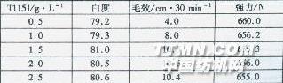 2 结果与讨论2.1精练酶T1151用量 选取0.5~2.5 g/L精练酶T1151,加入30%双氧水5ml/L,100℃煮漂50 min,按照1.2.1工艺进行试验,测试处理后织物的各项性能见表1。表1精练酶T115I用量对织物性能的影响