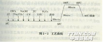 ,高度1560mm。纱管托架由一个中心柱吊钩、一个托盘和32根网状柱组成。每根柱子装9个筒纱。工作时将纱管套在网状柱上用螺栓紧固。操作时先在589.2—687.4kPa气压下开动并排除储汽缸及滤水器中的余水,开启电源,清理锅内外清洁工作。开进水阀,关闭排水阀。按工艺要求加料,吊纱进锅,关盖。开主泵电动机,打开内外流量阀,开进水阀、放汽阀、输送活塞及副缸冷却水,关好主缸排水,副缸排水、储汽缸电源及洗涤汽阀。由平衡阀及放汽阀放水,主、副缸水位在2/3时关上进水阀、平衡阀及放水阀。然后开动副泵电动机,注意保持压力正常。按工艺规定升温、保温、降温。排液时锅内温度不得高于8℃,关主、副泵电动机,打开放汽阀,待压力降到零时开平衡阀,然后开主、副缸阀放水。 ③煮漂一浴法处方。软水剂S7 0.5g/L,稳定剂AWN lg/L,Na2CO36g/L,NaOH(95%)4g/L,增白剂CF 0.2g/L,碱油JU O.25g/L,碱油DTC 0.75g/L,双氧水(50%)8g/L。工艺曲线如图2—2所示。工艺操作:纱线人锅后,封闭锅口,控制水流量。进水到要求时开循环泵,控制压力在3kg/cm2,从副缸加入各种配好的助剂。流量控制由内流至外流。练漂结束后,排液。进水热洗(100℃,20min),降至80℃,放水。将纱管吊起,锅内进水,加入溶解好的碱油DTC 0.5g/L.白剂CF 0.1g几,开泵循环均匀,落纱。100℃处理30min,降温至80℃放水。再用软水清洗至pH值至7.5以下,检查白度合格,再进行柔软处理。