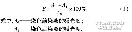 dash;L和深蓝2S.GL(DyStar公司)。化学试剂柠檬酸,磷酸氢二钠,醋酸,醋酸钠(均为分析纯)。1.2 染色试验将等重的蚕丝和锦纶织物置于同一染浴以模拟蚕丝/锦纶交织物的染色。蚕丝、锦纶以及模拟的蚕丝/锦纶交织物的染色基本处方如下:染料2%(owf),pH值5,浴比50:1。在pH值对蚕丝/锦纶交织物同色性影响试验中,采用柠檬酸/磷酸氢二钠缓冲液调节pH值至2.2,3,4,5和6;其余试验用醋酸/醋酸钠缓冲液调节pH值至5。染色工艺 40℃ 始染,升温至95℃ 后保温60 min,水洗,晾干。1.3 测试方法染料的上染百分率(E) 采用残液比色法测定,染液在最大吸收波长下的吸光度在uV.1800型紫外可见分光光度计(日本岛津公司)上测定,上染百分率按式(1)计算: