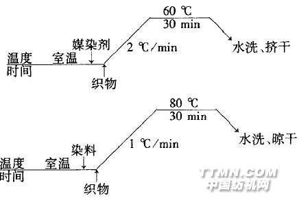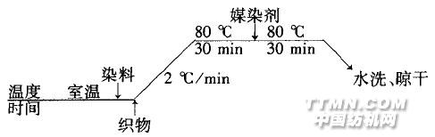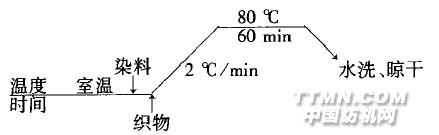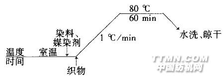预媒染色、同浴染色和后媒染色法对其染色,研究染色方法与染色织物性能的关系。(1)直接染色法染色工艺曲线