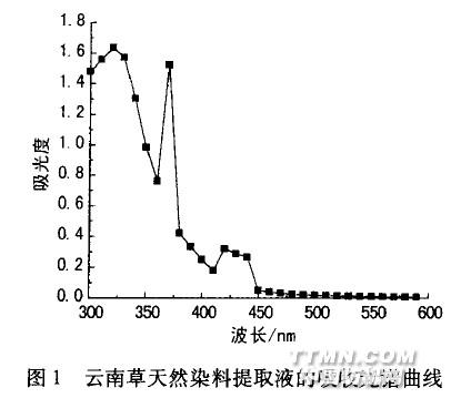 天然染料来自于自然界中的动植物,具有较好的生物降解性和环境相容性,部分天然染料还具有防虫杀菌的功效。采用天然染料染色的纺织品,色泽自然优雅,色调独特别致,能满足人们追求个性化、多样化的需求。目前,国内外有很多研究人员都在研究天然染料的提取和染色。如我国辽东学院的姜洪武提取板栗树皮对丝绸染色,东华大学的黄旭明研究茶叶对真丝的染色性能;巴基斯坦的Shaukat Ali提取指甲花染料对棉织物染色,印度的 r.Deepti Gupta研究了5种天然染料对合成纤维的染色性能。我国地域辽阔,拥有丰富的天然植物资源,因此,研究和开发天然染料的提取和应用工艺,综合利用植物的叶、花、果实及根茎等,具有很好的现实意义。本项目选择一种在我国云南地区广泛种植的姜科属植物(俗称云南草)为原料,就其最佳提取条件以及对真丝织物的染色性能进行研究。l 试验1.1 试验材料与设备织物: 真丝电力纺(常州亚邦生物科技有限公司)。染料: 云南草植物(常州亚邦生物科技有限公司)。助剂氢氧化钠,盐酸,十二水硫酸铝钾,七水合硫酸亚铁,硫酸铜(以上均为分析纯,国药集团化学试剂有限公司),三氧化二钠(99.95% ,江苏省宜兴市唯高色釉料有限公司)。设备:FZ102微型植物粉碎机(天津泰斯特仪器有限公司),wFZ UV-2100紫外可见分光光度计(尤尼柯仪器有限公司),超声波细胞粉碎机(JY98—3D,宁波新芝科学仪器研究所),Premier 8400电脑测色配色系统(美国爱色丽股份有限公司)。1.2 试验方法1.2.1 云南草植物染料提取工艺将云南草在冷水中清洗两次,去杂、干燥、粉碎。取2 g云南草粉末置于250 mL烧杯中,加入一定量氢氧化钠,在一定温度下于恒温水浴锅中煮一段时间,取出。用涤纶织物和滤纸依次过滤提取不同次数后,将滤液合并定容。1.2.2 染色方法将定量真丝织物用水润湿后,分别采用直接染色、