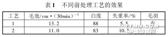 工艺条件 浴比1: 10,95 ℃ × 50 min前处理效果见表1。