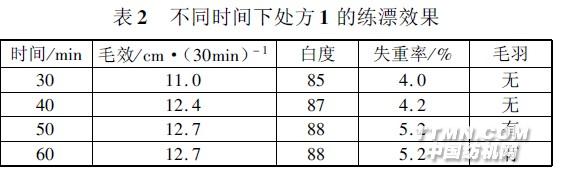 由表1 可知,用精练漂白剂处理的无捻纱浴巾毛效好、白度好,且失重少,但工作液中都含有毛羽,最终选择工艺1。2. 1. 2 练漂时间的确定采用处方1 在95 ℃下试验不同时间的练漂效果,结果见表2。