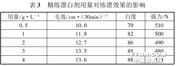 表2 试验结果表明,在40 min 内,无论是毛效、白度,还是失重,都能达到染色要求。时间越长,织物的表面毛羽越多。为了达到染色要求和让更多的毛羽裸露出来,确定练漂时间为40 ~ 60 min。2. 1. 3 精练漂白剂的用量在95 ℃、40 min 的条件下,试验精练漂白剂的用量对练漂效果的影响,结果见表3。
