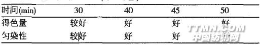 大样证明:65℃染色易掌握,染色均匀得色量较好。2.1.3染色时间(中浅色)