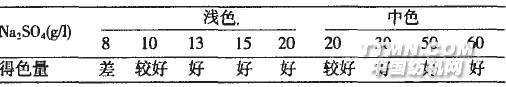 染浅色时Na2S04的用量为1Og /l-15g/l,染中色时Na2SO4的用量为20g/l-50g/l.