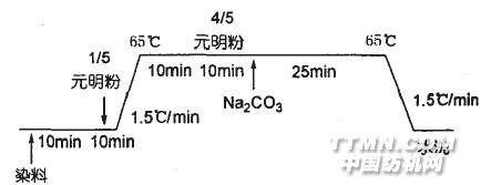 大样生产证明,染浅色时Na2CO3用量为5g/l-10g/l染中色时Na2C03用量为13g/l--15g/l。(以上都是目测)。2.1 .6 升 温曲线及助剂的加人