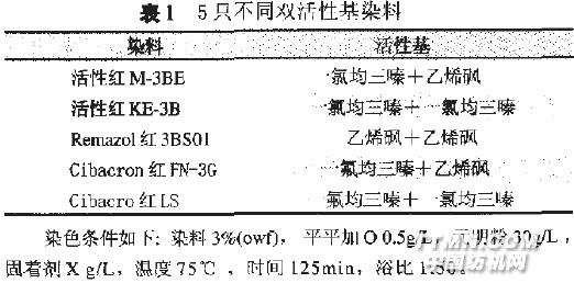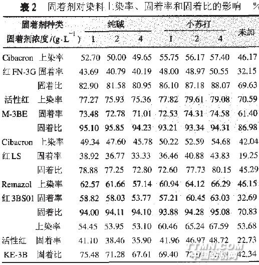 试 验结 果 见表2。试验结果显示,不论何种a}Ir f基染料,加固着剂与不加固着剂相比,固着率都有不同程度的提高,固着比也有明显提高,意味着染色牢度也可能提高。说明真丝绸活性染料染色时,碱性固着剂是需要的从 固着 剂种类来看,纯碱的碱性虽然比小苏打大,但以小苏打作为固着剂的固着率却比较高。原因是碱性强虽然促使染料与纤维反应的作用大,但促进染料的水解作用也大。从表2也可以看出,纯碱的用量愈高,固着率反而愈低。此外,也与桑蚕丝素上可与活性染料反应的基团有关。从这些基团的种类及其含量来看,侧链不含伯轻基的丝氨酸含量最高,但它主要存在于丝素的结晶区,染料很难进入结晶区,所以与活性染料反应的几率很小。能与染料反应的主要是氨基、亚氨基及酪氨酸上的酚努基,前者的亲核性较好,而后者酚经基具有一定的弱酸性, 在较低碱性条件下,即可形成负离子所以在较弱碱性条件下,两者都可以较好地与活性染料发生亲核取代或加成反应。