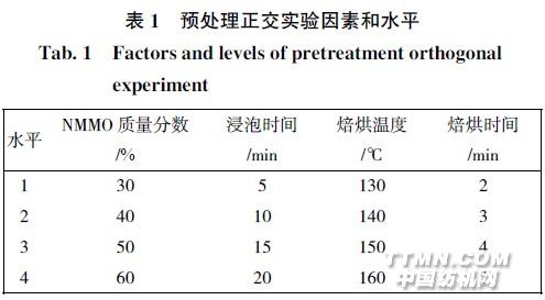 过退浆、煮练的半制品,纱线细度为28.1 tex,密度为236 根/10 cm. 所用药品包括:NMMO 溶液,含NMMO 60%,无水硫酸钠,碳酸钠,均为分析纯;活性艳橙X-GN,活性艳红X-3B 和活性艳兰X-BR,商品染料.试验所用仪器包括:恒温水浴锅,SD-400 型轧车,广东省鹤山精湛染整设备有限公司产品;Hz-85型热定型机,UENOYAMA KIKO CO LTD 产品;Y571B 型摩擦牢度仪,温州纺织仪器厂产品;X-rite 8200 型积分球式分光光度计,美国爱色丽公司产品;YG065N 型电子织物强力试验仪,山东莱州市电子仪器有限公司产品. 1.2 实验方法1.2.1 NMMO预处理苎麻织物NMMO浸泡苎麻织物一定时间(60 度,浴比1 :5)--二浸二轧(轧余率80%)--热风焙烘--热水洗3次--80 度烘干.实验按照表1 所示的正交实验工艺进行.