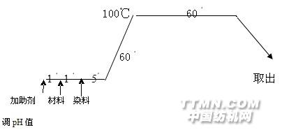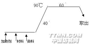流程:配制染液→纤维润湿→挤干→入染→按升温曲线染色→水洗→晾干