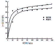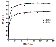 染色速率曲线是染料在纤维上的扩散性的表征,曲线的斜率反映了染料在纤维上的上染速度。由图1可见,在染色的初始阶段上染迅速,随着上染的进行上染速率降低,最终趋于稳定。这说明较多的染料吸附发生在染色的最初阶段。在同一上染时间,染料在雄蚕丝上的上染百分率要高于棉纤维,说明直接染料在雄蚕丝上比棉要有较好的染色性能。