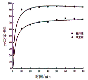 将染料1%(o.w.f)、元明粉35g/L和水配制成染液,浴比1:50,升温至一定温度后投入纤维,在染色过程中每隔一定时间取样测吸光度,计算上染百分率。