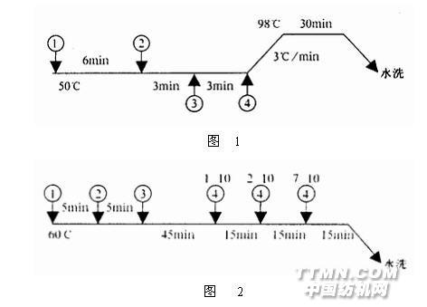 l 竹纤维的性能1.1竹纤维概述 竹纤维是一种纤维索纤维,它是以竹子为原料利用特殊的工艺处理,把竹子中的纤维素提取出来,再经制胶、纺丝等工序制造而成的再生纤维索纤维,其细度、白度与普通粘胶接近并具有滑爽、天然抗菌等特性.而且竹纤维是一种可降解的纤维,在泥土中能完全分解,对周围环境境不造成损害,可保护人类的环境。1.2 竹纤维的技术指标 竹纤维的技术指标略高于棉浆纤维,竹纤维的截面存在着许多中空结构,所以它比棉有更好的吸湿性和透气性。细度一般在1.1l~5.56dtex,长度为31~76 mm.2 产品生产工艺2.1 针织工艺 纬编针织汗布所用原料为l 8.2ltex(32 Ne)纱,幅宽l 04cm,面料克重:94g/m2,密度75线圈/5cm, 所用设备为Z20 l台车。2.2 染色工艺 漂白处方(g/L):①渗透剂l ②硅酸钠l ③(双氧水(30%)为 2 ④氢氧化钠1.5,浴比20:1,pH值l0~11。 染色处方(g/L):①Cibacron红FN-R染料0.5%(owf) ②助剂RC为1 助剂DBC为2 。③硫酸钠40 ④纯碱10 浴比50:1 漂白工艺见图1,染色工艺见图2。
