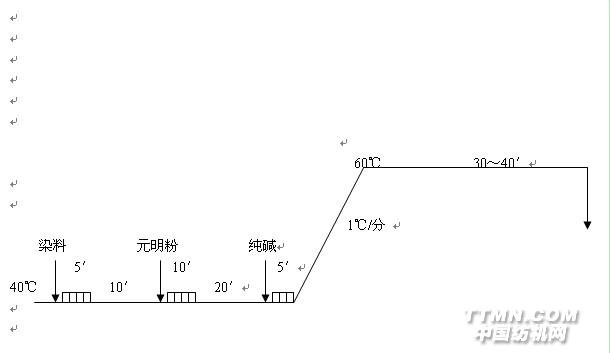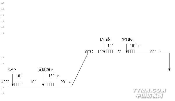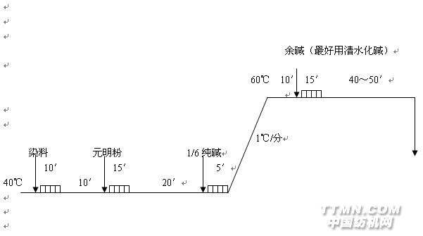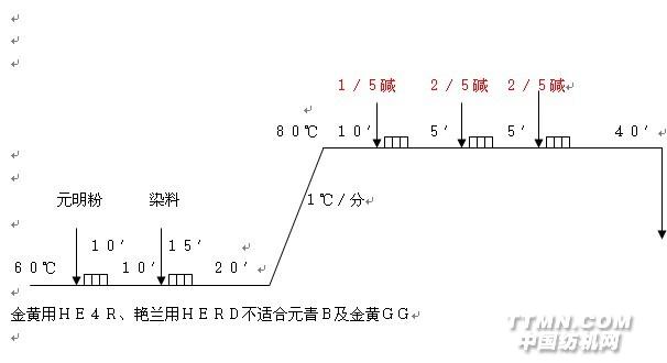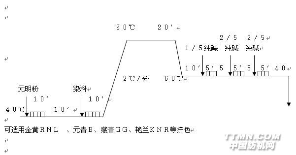 2.中色敏感色:分批加元明粉,60℃分几次加碱,提高一次吸尽率,保证重染性;化碱最好清水,边回流边进;仿样要与大机加元明粉、加碱步骤相同。 对碱剂敏感,在加碱固色的初始阶段,“瞬间上色”现象突出的染料,应采用“预加碱升温法”染色。即在室温染液中,加入1~2g/L纯碱,使染浴呈现弱碱性。这样,在缓慢升温和保温吸色过程中,可以有效提高纤维对染料的吸色量,减缓加碱固色初期“瞬间上色”的程度,从而提高匀染效果。但要注意二点: 第一,预加纯碱量不宜过多,以浅色1g/L、中色1、5g/L、深色2g/L为宜,若预加碱过多,反而容易色花。 第二,必须以1℃/min缓慢升温。升温太猛,上色快对匀染吸附不利。 具体工艺为:(活性黑KN-B、艳蓝KN-R、嫩黄M-7G等对碱敏感)
