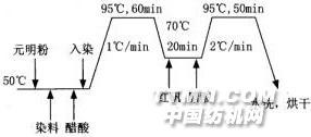 图1染色工艺曲线2 测试2.1 上染百分率用紫外可见分光光度计在最大吸收波长(λmax)处分别测定染色前后染浴的吸光度,由下式计算上染百分率E:
