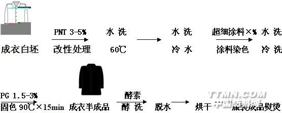 【改性时的pH值】使用改性剂T、PT应用Na2CO|3 或NaOH调节pH=9~10,使用PNT不必调节pH值。【改性后必须水洗】织物经改性剂处理后一定要充分水洗呈中性,若不充分水洗,当涂料一加入就立即被残留在水溶液中的增深剂吸附而凝聚使涂料的利用率大大降低,一般要降低20%~30%。涂料没有充分利用,染深性明显下降。【 涂 料 】涂料一定要选用粒子小、粒径均匀、环保的染色涂料。染色用涂料应具有良好的日晒、气候及升华牢度,还应具有耐酸、碱、氧化剂、还原剂的特征,较高的着色力和遮盖性,色泽鲜明,其粒子细度应在0.2~0.5u之间,并要求颗粒均匀,切勿用印花涂料代替染色涂料,对牢度及染深性都有降低。【染 色 温 度 】其包括始染温度、升温速度和最终染色温度。始染温度一般控制在30~40℃,升温速度控制在1~2℃/min,我们建议最终染色温度控制在60~70℃。如果升温速度太快会影响染色的均匀性,会导致色花等疵病;最终染色温度太高对某些不耐高温的涂料反而影响上色率,并会引起色变。【染 色 浴 比】浸染法中成衣染色一定要浴比大,一般掌握在1:30,浴比太小,成衣在染浴中翻滚不均匀,增加与机械的摩擦力,极易造成白条、褶皱及色花。【染 色 时 间】纤维上活性基团是有限的,当涂料染色增深达到一定的饱和程度,即使改变染色条件(温度和时间)涂料并不能再吸附,因此一般20~25min已足够,深色产品可延长到35min。染色结束后用冷水清洗未被吸附的涂料,然后进行固色。【成衣染色工艺】