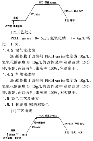 张 琳 余逸男 陈水林(东华大学化学化工与生物工程学院,上海201620)涤 /棉混纺织物通常采用二浴二步染色法,即用分散染料染涤纶—还原清洗—活性染料套染棉。整个染色工艺耗时长、生产效率低、能量消耗大、污水排放量大 [1]。现在已经有染整工作者在研究涤/棉活性/分散染料一浴法染色[2],但是仍然存在活性染料上染率不够的问题。棉纤维阳离子化是一种比较直接、有效解决活性染料染色问题的方法。对纤维素纤维进行化学改性,通过用含有不同活性基团的胺或反应性阳离子改性剂处理棉, 减少或清除纤维上的负电荷效应,可以提高纤维吸附染料的能力[3-6]。聚环氧氯丙烷二甲胺衍生物(简称PECH-amine)是一种较新型的纤维素纤维改性剂,此改性剂分子量低、含氮量适中,在中性、碱性条件下无明显阳离子性,所以可以在保证匀染的前提下提高活性染料在棉纤维上的上染率,甚至可以在中性、无盐条件下将一些质量分数为2%的单色染浴完全吸尽[6]。本文尝试用纤维素改性剂PECH-amine对涤/棉混纺织物进行处理,希望通过预处理来提高涤/棉染色中活性染料的利用率,不使用助剂,实现活性染料无助剂的清洁染色。 1试验 1·1药品 PECH-amine(自制);氢氧化钠(分析纯);氯化钠(分析纯);无水碳酸钠(分析纯);雅格素活性红NF-3B(上海雅运)(M型活性染料);雅格素活性黄NF-GR(上海雅运)(M型活性染料);皂片。 1·2织物白色平纹涤/棉织物(65/35,经精练、漂白)。 1·3仪器电子天平(上海精科)、电热恒温水浴锅(上海跃
