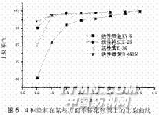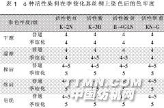 分别在3 min后和4 min后完成。上染结束后4种染 料的吸附率都达到100%。染色残液无色透明,完全 看不到有染料的残留。染色过程中不需要加硫酸钠进 行促染。 用碳酸钠进行固色的过程中,固色液也无色透明, 4种染料的上染率都达到100%。煮浮色时,煮液也无 色透明,固色率也达100%。 活性染料与真丝绸之间的化学反应效率不可能达 到100%,一定有部分染料被水解,产生浮色,相当于直 接染料吸附在真丝绸上。但是,在煮浮色时,这些浮色 却不会被煮下来,表明接枝在真丝绸的季铵阳离子与 染料分子的电荷作用加上染料分子与丝素蛋白范德华 力作用非常大,足以抵抗水分子的热运动对其产生的 作用而不掉入水溶液中。这预示着其皂洗牢度会很高。 2.3季铵化真丝绸染色后的色牢度 表1是4种活性染料在季铵化真丝绸上染色后的 各种色牢度。从表1可以看到,干摩擦牢度没有变化, 湿摩擦牢度有一定的升高。棉沾、丝沾、皂洗牢度都普 遍升高。这是季铵化真丝绸上的阳离子对阴离子染料 的强相互作用、以及染料分子与丝素蛋白的范德华力 作用的共同结果,使得染料分子牢牢地吸附在真丝绸 上,所以色牢度升高。