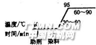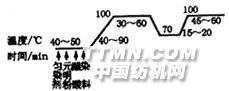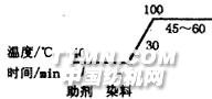 图2 弱酸艳红B升温曲线2.3.3 酸性媒介枣红 染色处方 %(o.w.f.对织物重) 染料 2 醋酸(98%) 1~3 元明粉 10~15 浴比 1∶50 红矾钠 0.4~2 升温工艺见图3。