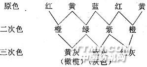 2 配色设计要求 在染色应用中,配色工作者必须首先明确颜色的拼色性能。我们把最单纯的红、黄、蓝三色叫作三原色,因它们被认定为无法用其它颜色拼成的色泽,而其它的颜色,都是可以用红、黄、蓝三色以不同的比例混合拼成的。 如果把红、黄、蓝三色等量混合,可得黑色。如果把两种不同的原色相配(拼合),可得橙、绿、紫3种二次色。2种不同的二次色拼合,或者任意一种原色和黑色拼合所得的颜色,称为三次色。 最主要的二次色和三次色可以说明如下:
