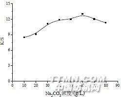 图 3.1 预轧碱液浓度对织物染色后K/S 的影响由图 3.1 可知,随着Na2CO3 浓度的增加,染色织物的K/S 值随着浓度的增加而增加,当浓度增加到40g/L 后,K/S 值增加缓慢,因此从控制碱用量出发,固色用碱剂Na2CO3 的浓度确定在40g/L 较为合理。在本实验的D5 反胶束染色时,固色碱是预先浸轧在织物上的,织物带碱量有限,由于在染料反应的过程中不断有H+生成,中和了固色碱,从而使固色碱的用量不断减少,固色过程中的pH 下降,导致固色效果下降。故提高Na2CO3 浸轧碱液的浓度使Na2CO3 适当过量比较有利:多余的Na2CO3 可以补充反应过程中消耗的碱,保证了反应过程中所需的pH 值,有利于固色反应顺利进行。3.1.3 染色时间的优选D5 反胶束染色过程中仅有极少量的水,染液浓度远远高于普通水浴中的染液浓度,而且处在非极性介质的包围中,此时的染料溶液对纤维素纤维具有很高的亲和力,上染的速度很快,因此可以预期D5 反胶束的染色时间相比传统水浴染色要短。为证实这一推测,用活性红3BS 在相同浓度Na2CO3 作为固色剂的条件下进行了不同染色时间的实验研究,用K/S评价染色效果,结果如图3.2 所示。