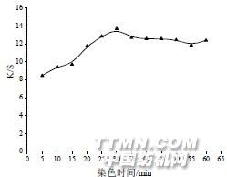 图 3.2 染色时间对织物染色后K/S 的影响反胶束染色时,织物预先浸轧了碱液,因此带有一定量的水分;高浓度的染液增溶在反胶束中,处在极性完全相反的D5 介质包围中。在这种情形下,按照维持体系能量最低的规则,染液很容易舍弃D5 介质向亲水性的纤维以及纤维上所带的水分转移,上染的速度很快