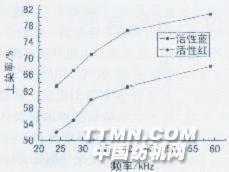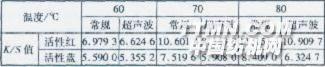 图3上染率随超声波频率的变化 图3中,染料的上染率随超声波频率的增加而增大。在超声波发挥较好效应的35~45 kHz内,适当提高超声波频率,有利于染料的上染。2.4超声波对K/S值的影响 测定60、70、80℃时,常规和超声波条件下染色羊毛织物试样的K/S值,见表1。表1 常规和超声波条件下染色羊毛织物K/S值