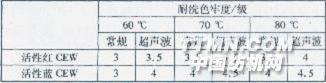 由表2知,超声波可明显提高染样的摩擦牢度,原因可能是超声波的热效应和空化效应加速了染料的溶解、分散及羊毛纤维的溶胀,使得染料充分进入纤维内部。 表3常规和超声波条件下染样的耐洗色牢度.jpg)