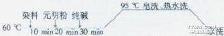 1 试验1.1材料和仪器 织物 300 cm 9.7 tex×7.3 tex 681根/10 cm×677根/10 cm真丝/棉交织物。 助剂 醋酸、元明粉、纯碱、净洗剂(均为工业级)。 染料 NOVACRON FN,S,W和C系列(一氟均三嗪型/乙烯砜型,亨斯迈公司);Remazol系列(乙烯砜型,德司达公司);Rifafix系列红3BN,黄3RN,蓝2GN和嫩黄4GL;Rifazol系列翠蓝G,艳蓝R-SP(一氯均三嗪型/乙烯砜型,日本理禾公司)。 仪器 Datacolor SF600分光光度仪(Datacolor公司),721型分光光度计,自动滴配液设备和染料(粉状)自动称量设备(杭州三锦科技有限公司),振荡水浴锅。1.2染色工艺 浴比1:15,织物2.5 g。 染色工艺曲线