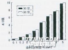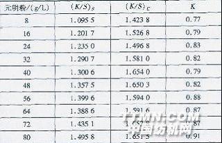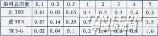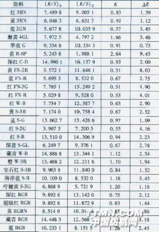 2 结果与讨论2.1染料筛选 为使真丝/棉双组分面料获得良好的同色性,首先要选择合适的活性染料。本试验分别选用不同厂家的活性染料对真丝/棉交织物进行染色,通过分析其表观深度K/S值与色差△E,筛选出同浴染色同色性较好的三原色染料。 表1 不同染料的染色同色平衡值置及色差△E