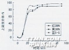 注:染料2%,元明粉80 g/L,纯碱27 g/L。 表1中,有7只染料在真丝/棉交织物上的同色平衡值K为0.8~1.2,且色差△E≤1.5,可认为真丝/棉交织物的染色同色性较好;有10只染料在真丝/棉交织物上的同色平衡值K<0.8,且色差△E≥1.5,真丝/棉交织物的染色差异较大,并且棉深于丝;有3只染料在真丝/棉交织物上的同色平衡值K>1.2,且色差△E≥1.5,真丝/棉交织物的染色差异也较大,并且丝深于棉。 综合考虑K/S值、K值和AE值,在7只同色性较好的染料(红3BN、黄3RN、蓝s-G、宝石红s-3B、柠檬黄S-3G、超级红RGB与翠蓝G)中,选择染料红3BN,黄3RN和蓝s-G作为三原色进行同浴染色。2.2上染速率曲线 为了解活性染料三原色红3BN,黄3RN和蓝S-G