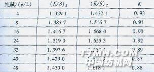 注:拼色处方见表2,染料总用量0.5%(owf),纯碱27g/L。 由表3可知,随着元明粉用量增加,真丝与棉织物的染色深度都有所提高,且同色性也提高;当元明粉用量增加至56 g/L后,同色平衡值K变化不大。综合考虑,元明粉用量以56 g/L为宜。2.3.2纯碱 表4纯碱用量对真丝/棉交织物两色性的影晌