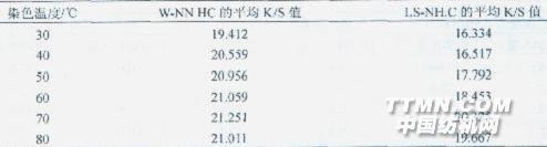 1 基本性能1.1对染色深度的影响 固色碱是活性染料染色的主要助剂,活性黑W-NN HC与活性黑LS-NH.C在不同染色温度下的表面深度值见表1,其中固色用碱为碳酸钠,加入量为30 g/L,食盐30 g/L,浴比1:50,染色保温时间为20min,染色后只在25℃下水洗10 min,不做皂洗处理。染色用织物规格为织物规格:19.5tex×19.5tex(30 S×30 s)的全棉平纹细布。染色设备为高温常压甘油染样机,染色深度为7%(O.w.f.)。自动测色配色仪型号为Datacolor SF600X型,表面深度值为580 nm处的平均值。表1不同染色温度对活性染料染色深度的影响