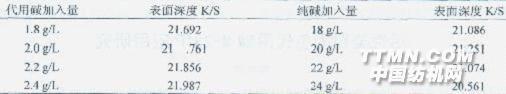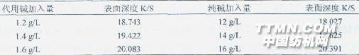 由表1数据可知,在保持染色深度最大化前提下,适宜于两种活性黑染料染色温度为70℃,那么,代用碱M-231P在70℃下对染色深度的影响如何呢?以活性黑W-NN Hc为例,比较代用碱不同的加入量对织物表面深度的影响,相关数据见表2。其中,织物规格、染色时间、染色浴比、染色设备、染后水洗条件、染色深度和食盐加入量均与表1相同。表2代用碱不同加入量对织物表面深度的影响