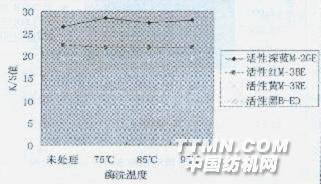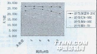 图7酶洗pH值对织物表面色深值的影响 从图7可知,随着酶洗pH值变化,织物表面色深值有一定变化,活性黄M-3RE在pH值>8和pH值<6时织物表面色深值明显降低,即色泽变浅;活性红M-3BE和活性黑B-ED在pH值<6时,表面色深值比未处理时提高,当pH值>8时,表面色深值降低:活性深蓝M-2GE随着酶洗液pH值变化织物表面色深值变化不入。因此,为了使织物在酶洗前后色泽波动