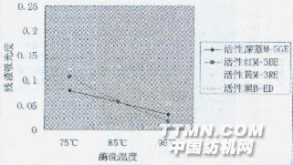 图5酶洗温度对织物表面色深值的影晌 从图5可知,随着酶洗温度的提高,织物表面色深值变化不大,且λmax不变,这又一次印证了前面的推测。活性深蓝M-2GE表面色深值出现一定的波动,可能是染色织物不均匀所致。3.4.2 RP酶洗涤温度对洗涤残液色度值的影响 将所测的残液色度值作图如下: