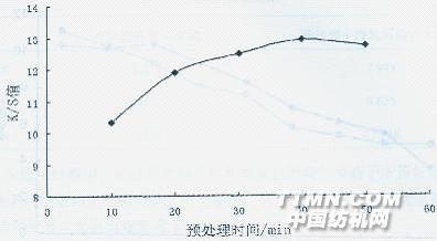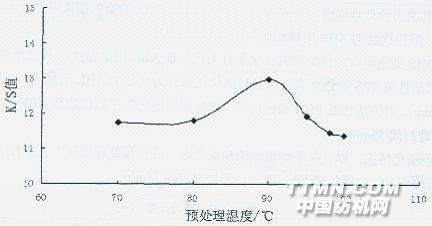 图3预处理温度对染色K/S值的影响 图3中可以看出,预处理温度在70℃、80℃时,温度对织物的K/S值的影响不明显;当温度达90℃时,染色织物的K/S值显著提升,继续升温,K/S值降低。这说明90℃时代盐剂ABE与纤维素纤维反应最为充分,对织物的染色深度值的提高影响最大。3.2.4 预处理时间对染色的影响 在代盐剂ABE为5g/L,碱剂EH为1g/L,预处理温度为90℃的情况下分别对棉织物处理10、20、30、40、50 min,水洗后烘干,再采用活性蓝FBN进行冷轧堆法染色,染色后对织物的K/S值进行测试。