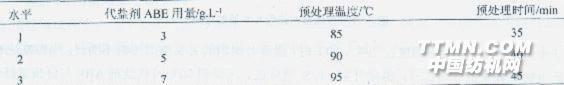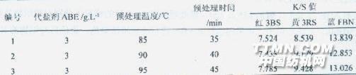 图4预处理时间对染色K/S值的影响 由图4可知,当预处理时间由10min增加到40min时,K/S值显著增大,说明预处理时间的延长,有利于代盐剂ABE与纤维素的充分反应。当处理时间为40 min时,K/S值达到最大值,此后随着时间的延长,K/S值开始下降,但变化幅度不是很大,所以预处理的时间不宜过长,40分钟即可。3.2.5 预处理工艺优化 在上述单因索研究的基础上,进一步优化预处理工艺条件,采用正交试验法,设计表和试验结果见表2、表3。 表3所示,对活性红3BS和活性蓝FBN染色而言,预处理中影响染色效果的最主要因素是代盐剂ABE的用量,其次为预处理温度、预处理时间。从活性黄3RS的染色结果可以看出,虽然预处理时间的极差值最大,但和代盐剂ABE用量相比差距并不是很大。 对活性红3BS染色而言,预处理的优化条件为代盐剂ABE用量5g/L,预处理温度95℃,预处理时问35min;对活性黄3RS染色而言,预处理的优化条件为代盐剂ABE刚量5g/L,预处理温度85℃,预处理时间45min。对染活性蓝FBN染色而言,预处理的优化条件为代盐剂ABE用量5g/L,预处理漏度85℃,预处理时间35min。 综合三原色染色情况,以及从