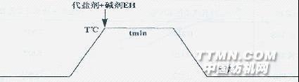 2 买验部分2.1实验材料 纯棉机织半制品(441根/10cm X 352根/10cm) 活性染料蓝FBN、活性染料红3BS、活性染料黄3RS(台湾永光化学工业股份有限公司),代盐剂ABE、碱剂EH、碱剂S(广州金瑞鹰生物化学有限公司),碳酸氢钠、中性皂粉、氢氧化钠(北京化工厂)。2.2实验仪器 MINOLTA CM-3600D测色配色系统(意大利ORINTEX公司),SOT2-24常温振荡染色机(东成染色机器厂有限公司),JMU505T型台式轧车(北京纺织机械器材研究所)、101A-3型电热鼓风干燥箱(上海申光仪器仪表有限公司),722可见分光光度计(上海欣茂仪器有限公司),YG-631汗渍色牢度仪、SW-12型A耐洗色牢度测试机(无锡纺织仪器厂),Q-SUN3100HS日晒牢度仪(美国Q-PAR公司),Y571A染色摩擦牢度(浙江温州纺织仪器厂)。2.3实验方法2.3.1 预处理处方及工艺预处理处方: 代盐剂ABE Xg/L 碱剂EH Yg/L 温度 T℃ 时间 tmin 浴比 1:50预处理工艺曲线: