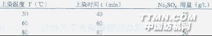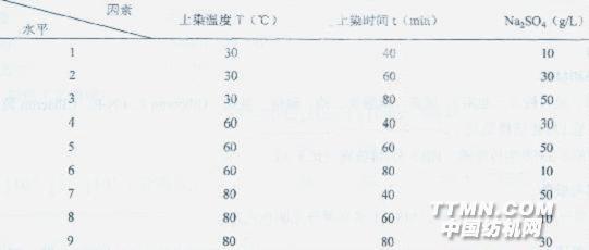 2 实验2.1上染工艺条件优选 竹纤维和棉纤维在化学结构上同属纤维素纤维,但由于竹纤维属于多孔异形纤维,与棉存在著异,上染率较低,上染较慢,所以必须选择上染速率一致的染料并对染色工艺条件进行优选。 染色处方: 织物重2g,染料(红、黄、蓝)浓度2%(o。W.f),浴比为1:30。采用正交实验的方法,测定不同温度、不同上染时间、不同盐用量条件下的K/S值。从而确定最佳染色工艺。 先将织物用热水浸渍后挤干,放入染液,染色10分钟后加入一半的盐,再染10分钟加入另一半的盐,然后续染至所需时间。染毕将织物洗净晾干测其R值,通过查表得出K/S值。表1水平因素表