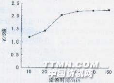 图3染色温度对织物断裂强力的影响2.3染色时间的影响 染料用量2%,调节染浴pH值为5,在110℃分别染色10,20,30,40,50和60 min,比较各个染色时间后的染色深度。