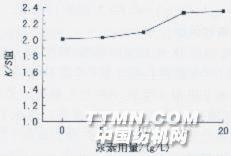 图4染色时间对染色深度的影响 图4中,染料的上染过程主要体现在前30 min,染色30 min后,染色深度虽有一定增加,但增幅缓慢,说明染色30 min时还原桃红R在玉米纤维上的上染量基本达到平衡。将染色时间定为30 min,既能达到较满意的染色效果,又可节省能源。2.4尿素的影响 染浴中分别加入0,5,10,15和20 g/L尿素;染料用量2%,调节染浴pH值为5,在110℃染色30 min,比较各个尿素用量下的染色深度。