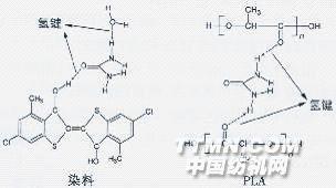 图5尿素用量对染色深度的影响 尿素起助染作用,可提高玉米纤维织物的得色深度。图5中,随尿素用量增大,得色深度增大,当尿素用量达15g/L时,染色深度相当于120℃不加尿素所染的深度;再增大尿素用量,助染效果提高不明显。 尿素能起助染作用的机理主要是,尿素通过氢键的作用使染料增溶和使玉米纤维溶胀,如图6所示。